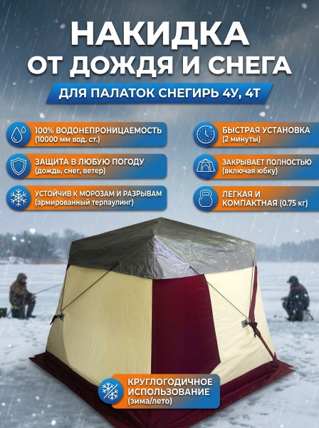 Накидка от дождя на палатку Снегирь 4У и 4Т - ОписаниеАнтидождевая накидка 4У и 4Т защитит вашу зимнюю палатку от намокания во время дождя и мокрого снега. Накидка выполнена из Терпаулинга, влагонепроницаемостью 10000 мм.вд.ст, именно этот показатель обеспечит вам полную водонепроницаемость и ваша палатка останется сухой в любую погоду. Установка накидки займет всего пару минут и в дальнейшем вам не придется сушить палатку.
