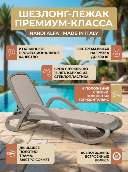 Шезлонг-лежак пластиковый Nardi Alfa - ДоставкаДоставка по Москве: бесплатно, 1-2 дняДоставка по Санкт-Петербургу: бесплатно, 2-3 дня Доставка по России: стоимость уточняйте у оператора. Шезлонг-лежак пластиковый Nardi Alfa - Отзывы0.0