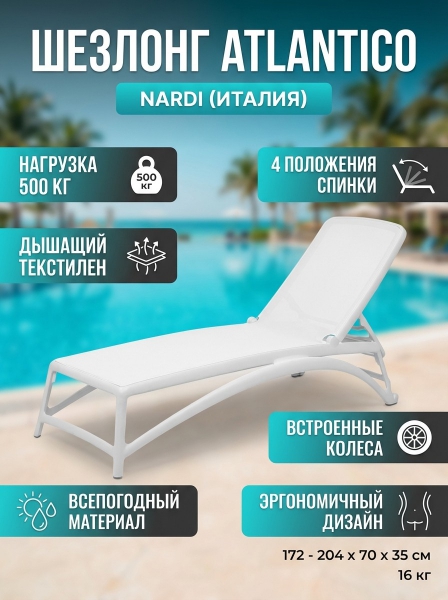 Шезлонг-лежак пластиковый Nardi Atlantico - ДоставкаДоставка по Москве: бесплатно, 1-2 дняДоставка по Санкт-Петербургу: бесплатно, 2-3 дня Доставка по России: стоимость уточняйте у оператора. Шезлонг-лежак пластиковый Nardi Atlantico - Отзывы0.0