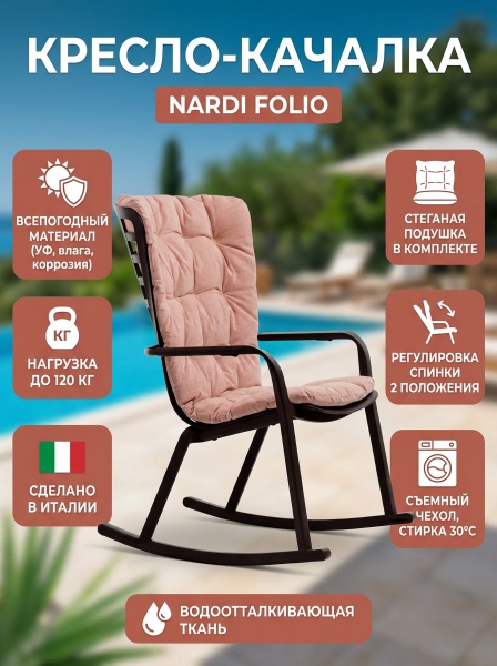 Кресло-качалка пластиковое с подушкой Nardi Folio, антрацит, розовый - ОписаниеFolio - это инновационное расслабляющее кресло, регулируемое в двух положениях, предназначенное для уличного использования. Изготовлено из перерабатываемой стекловолоконной смолы. Кресло Folio может быть выполнено с фиксированным основанием либо на ножках-полозьях как романтическое кресло-качалка. Основная конструкция кресла сделана из одного перфорированного стекловолоконного листа (отсюда и название на итальянском языке "folio"), украшенного квадратным узором.