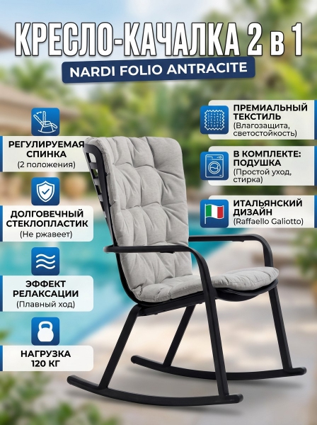 Кресло-качалка пластиковое с подушкой Nardi Folio антрацит, серый - БрендСтрана бренда: Италия Страна производства: Италия Премиальность бренда:Кресло-качалка пластиковое с подушкой Nardi Folio антрацит, серый - Характеристики
