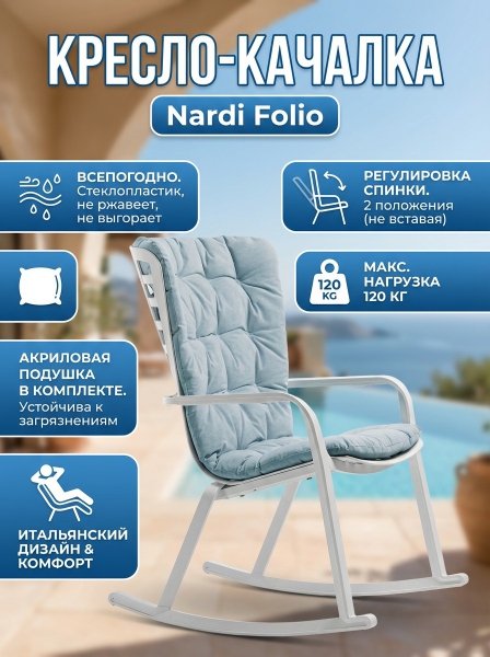 Кресло-качалка пластиковое с подушкой Nardi Folio, белый, голубой - ОписаниеFolio - это инновационное расслабляющее кресло, регулируемое в двух положениях, предназначенное для уличного использования. Изготовлено из перерабатываемой стекловолоконной смолы. Кресло Folio может быть выполнено с фиксированным основанием либо на ножках-полозьях как романтическое кресло-качалка. Основная конструкция кресла сделана из одного перфорированного стекловолоконного листа (отсюда и название на итальянском языке "folio"), украшенного квадратным узором.