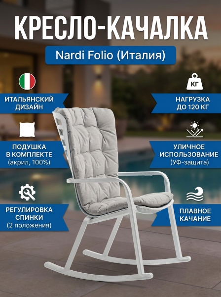 Кресло-качалка пластиковое с подушкой Nardi Folio белый, серый - БрендСтрана бренда: Италия Страна производства: Италия Премиальность бренда:Кресло-качалка пластиковое с подушкой Nardi Folio белый, серый - Характеристики