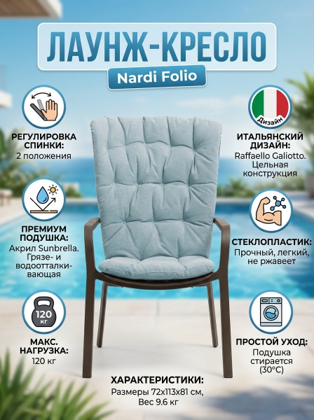 Лаунж-кресло пластиковое с подушкой Nardi Folio, табак, голубой - ДоставкаДоставка по Москве: бесплатно, 1-2 дняДоставка по Санкт-Петербургу: бесплатно, 2-3 дня Доставка по России: стоимость уточняйте у оператора. Лаунж-кресло пластиковое с подушкой Nardi Folio, табак, голубой - Отзывы0.0