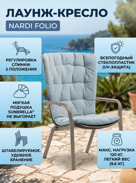 Лаунж-кресло пластиковое с подушкой Nardi Folio, тортора, голубой - ДоставкаДоставка по Москве: бесплатно, 1-2 дняДоставка по Санкт-Петербургу: бесплатно, 2-3 дня Доставка по России: стоимость уточняйте у оператора. Лаунж-кресло пластиковое с подушкой Nardi Folio, тортора, голубой - Отзывы0.0