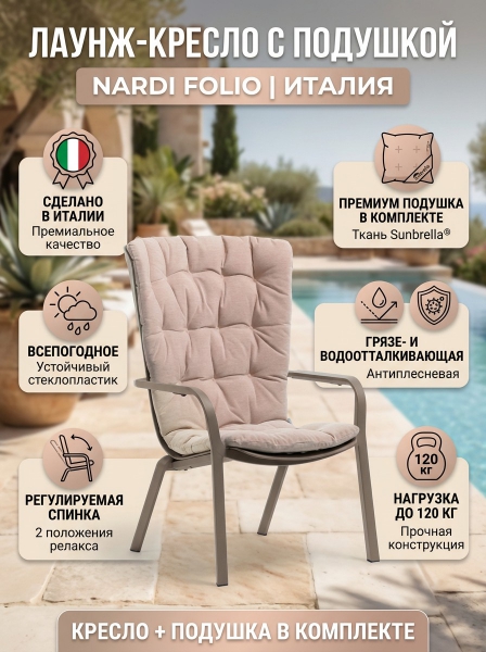 Особенности: - Каркас кресла выполнен из стеклопластика, преимуществами которого являются долговечность, устойчивость к воздействию коррозии и солнцу. - Прочность структуры стеклопластика можно сравнить с показателями стали, при этом изделия из стеклопластика в разы легче металлических. - Благодаря простому и удобному запатентованному Nardi ручному двухкнопочному механизму, спрятанному под подлокотником, спинку кресла можно отрегулировать в двух положениях с комфортом и легкостью. - В комплекте удобная стеганая подушка, которая легко и незаметно крепится к спинке двумя ремнями на липучках. Чехол на подушке несъемный, но ее можно стирать при температуре 30°C. Подушка выполнена из 100% окрашенного акрила с грязеотталкивающей и антиплесневой обработкой. Наполнитель - пенополиуретан. Плотность 18 кг/м3.