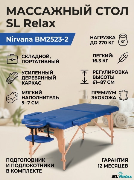 Массажный стол складной SL Relax Nirvana BM2523-2 - ДоставкаДоставка по Москве: бесплатно, 1-2 дняДоставка по Санкт-Петербургу: бесплатно, 2-3 дня Доставка по России: стоимость уточняйте у оператора. Массажный стол складной SL Relax Nirvana BM2523-2 - Отзывы5.0