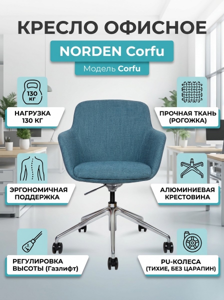 Кресло офисное Norden Corfu - ОписаниеСомневаетесь? - Посмотрите рейтинг ТОП-10 по категории «Ортопедические кресла»Конференц-кресло Corfu – стильное и современное решение для вашего офиса. Обивка из прочной ткани и наполнителя высокой плотности PU обеспечивает комфорт и долговечность. Механизм качания без фиксации и регулировка высоты добавляют удобства. Полированная алюминиевая крестовина и PU колеса подчеркивают элегантный дизайн. Идеально для переговорных комнат и конференц-залов.