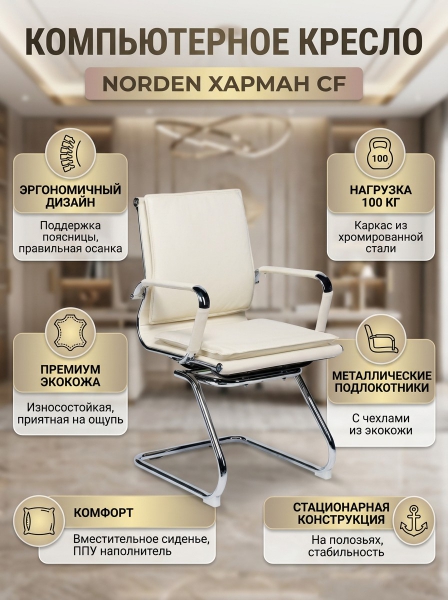 Кресло офисное Norden Харман CF - ОписаниеСомневаетесь? - Посмотрите рейтинг ТОП-10 по категории «Ортопедические кресла»Кресло Харман CF отличаетcя продуманным дизайном и является одной из популярнейших моделей для оснащения современных офисов. Подлокотники защищены съемными чехлами на молниях из экокожи. Это особенно удобно для тех, кто не любит соприкосновения руками с металлическими подлокотниками. Максимальная нагрузка 100 кг.