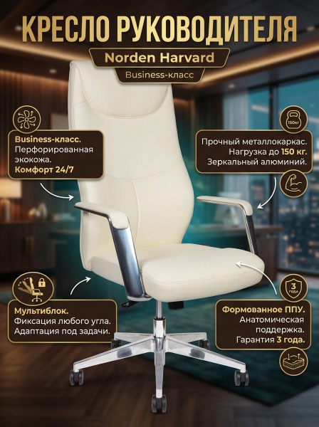 Кресло офисное Norden Harvard - ОписаниеСомневаетесь? - Посмотрите рейтинг ТОП-10 по категории «Ортопедические кресла»Новое кресло business класса. Отделка высококачественной перфорированной экокожей. В серии есть два типа директорских кресел, операторское кресло и конференц-кресло на полозьях. Подлокотники и крестовина из полированного алюминия. Высокое качество материалов и исполнения. Механизм качания мультиблок, выдерживающий нагрузку до 150 кг, с фиксацией наклона в любом положении. Гарантия от производителя 3 года. Сертификат BIFMA.