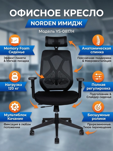 Кресло офисное Norden Имидж - ОписаниеСомневаетесь? - Посмотрите рейтинг ТОП-10 по категории «Ортопедические кресла»Суперсовременное кресло, выполненное с учетом новейших дизайнерских тенденций. Анатомический дизайн спинки и поясничного упора. Наполнение - memory foam. Регулируемый подголовник. Регулируемые Т-образные подлокотники с мягкой накладкой. Крестовина - высокопрочный пластик. Механизм качания - мультиблок с возможностью фиксации в любом положении. Слайдер. «Прорезиненные» ролики. Максимальная нагрузка 120 кг.