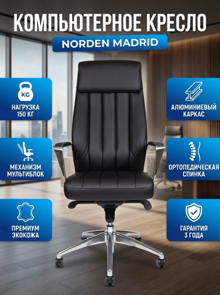 Кресло офисное Norden Madrid - ОписаниеСомневаетесь? - Посмотрите рейтинг ТОП-10 по категории «Ортопедические кресла»Новое кресло business класса. Отделка высококачественной экокожей. В серии есть два типа директорских кресел, кресло с высокой спинкой и конференц-кресло на полозьях. Подлокотники и крестовина из полированного алюминия. Высокое качество материалов и исполнения. Механизм качания мультиблок, выдерживающий нагрузку до 150 кг, с фиксацией наклона в любом положении. Гарантия от производителя 3 года. Сертификат BIFMA.