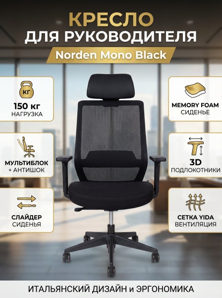 Кресло офисное Norden Mono black (черный пластик / черная ткань) - ОписаниеСомневаетесь? - Посмотрите рейтинг ТОП-10 по категории «Ортопедические кресла»Новая итальянская серия кресел совместного производства. Кресла- представляют собой итальянский стиль, оригинальный дизайн и высокую надежность. Механизм мультиблок с системой "антишок". Фиксация качания в четырех положениях. Подлокотники регулируемые 4 D. С накладками PU Спинка выполнена из сверхпрочной сетки (производство фирмы Yida, Тайвань), Сиденье - обивка ткань разных цветовых решений с наполнителес memory foam. Кресло оснащено Газ-лифтом - BIFMA SGS. Усиленная база из нейлона. Нагрузка до 150 кг.Гарантия производителя 3 года.