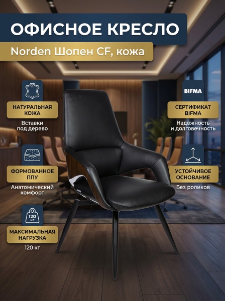 Кресло офисное Norden Шопен CF, черная кожа - ОписаниеСомневаетесь? - Посмотрите рейтинг ТОП-10 по категории «Ортопедические кресла»Первоклассное офисное кресло для конференций. Бежевая кожа и алюминиевые черные ножки создают неповторимый стиль роскоши. Задняя часть отделана высококачественным пластиком под натуральный шпон. Нижняя часть спинки со вставками из полированного алюминия. Кресло сертифицировано по стандарту BIFMA. Максимальная нагрузка до 120 кг.