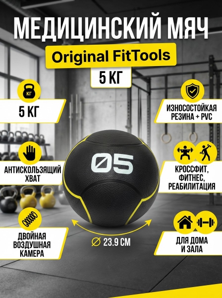 Мяч тренировочный Original FitTools 5 кг черный - БрендСтрана бренда: КНР Премиальность бренда:Посмотреть все набивные мячи (медицинболы) Original FitTools (12) Мяч тренировочный Original FitTools 5 кг черный - Характеристики