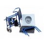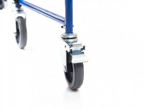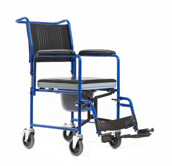 Каркас стула покрыт лакокрасочным составом, препятствующим развитию коррозии. Все материалы легко моются и пригодны для обработки дезинфицирующими средствами. Пластиковый приемник оснащен крышкой. В устройстве предусмотрены колеса, оборудованные тормозными фиксаторами. На подножках имеется текстильная лента для упора голеней.