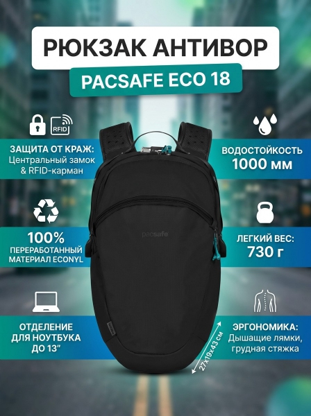 Городской рюкзак антивор Pacsafe ECO 18 черный ECONYL - Преимущества