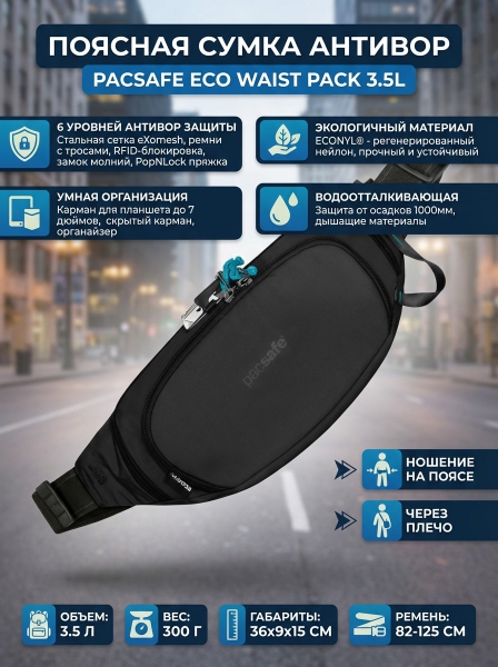 Поясная сумка антивор Pacsafe Eсо waist pack 3.5 л черный ECONYL - БрендСтрана бренда: Австралия Премиальность бренда:Поясная сумка антивор Pacsafe Eсо waist pack 3.5 л черный ECONYL - Характеристики