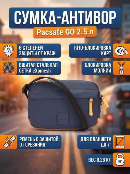 Сумка антивор Pacsafe GO 2.5 л синий - ДоставкаДоставка по Москве: бесплатно, 1-2 дняДоставка по Санкт-Петербургу: 395 ₽, 2-3 дня Доставка по России: стоимость уточняйте у оператора. Сумка антивор Pacsafe GO 2.5 л синий - Отзывы0.0