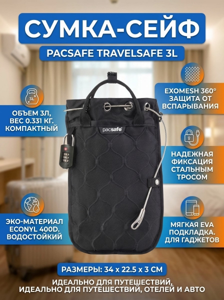 Сумка сейф черный Pacsafe Travelsafe 3L - ОписаниеПортативный запираемый сейф Travelsafe 3L объёмом 3 литра, теперь вы можете взять его куда угодно. Компактный размер с достаточным пространством для хранения ваших ценностей в вашем гостиничном номере или во время путешествия. Travelsafe® 3L идеально подходит для дополнительной безопасности в дороге. Мягкий внутренний материал предохраняет мобильные устройства и фото технику от царапин. Вшитая стальная сетка по всему материалу на 360° защищает от воровства и кражи ваших вещей. Защитная система от вскрытия:EXomesh 360° locking (вшитая стальная сетка по всему материалу).