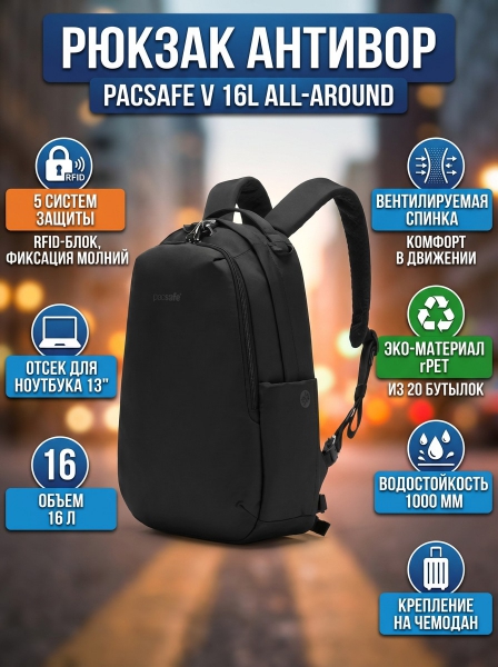 Рюкзак Pacsafe V 16L All-around Backpack, черный - БрендСтрана бренда: Австралия Премиальность бренда:Рюкзак Pacsafe V 16L All-around Backpack, черный - Характеристики