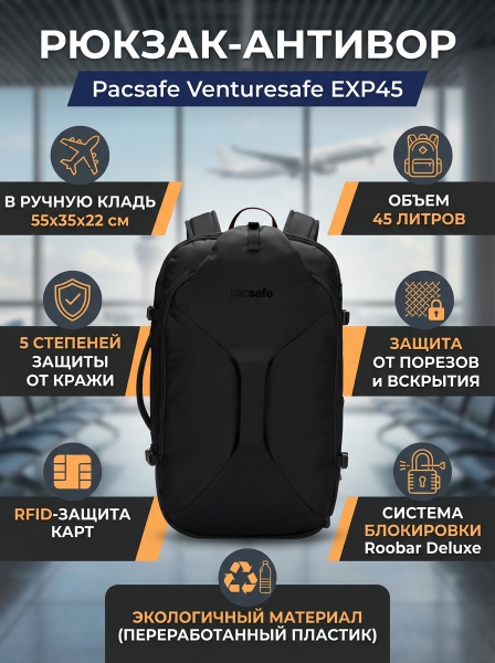 Рюкзак в ручную кладь антивор Pacsafe Venturesafe EXP45 черная смола - ДоставкаДоставка по Москве: бесплатно, 1-2 дняДоставка по Санкт-Петербургу: бесплатно, 2-3 дня Доставка по России: стоимость уточняйте у оператора. Рюкзак в ручную кладь антивор Pacsafe Venturesafe EXP45 черная смола - Отзывы0.0