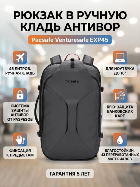 Рюкзак в ручную кладь антивор Pacsafe Venturesafe EXP45 темно-серый - ОписаниеPacsafe антивор Venturesafe EXP45 – серьезный рюкзак для настоящего путешествия. 45 литров внутреннего объема продуманны и организованы таким образом, что позволяют взять все необходимое для длительного путешествия по Индии или веселого европейского трипа. Органайзер основного отделения – залог порядка в мелочах и безопасности ваших гаджетов с рюкзаком Pacsafe Venturesafe EXP45 Рюкзак в ручную кладь антивор Pacsafe Venturesafe EXP45 соответствует самым строгим требованиям и нормам, предъявляемым авиакомпаниями «Победа», «Аэрофлот», «РОССИЯ», «Уральские авиалинии», «S7», «UTAIR» и т.д., к ручной клади. Путешествуешь налегке или едешь в короткую командировку. В рюкзаке Pacsafe Venturesafe EXP45 предусмотрено 5 степеней защиты от скрытого хищения. Рюкзак Pacsafe Venturesafe EXP45 не имеет аналогов в мире, все технологии запатентованы и уникальны. Рюкзак Pacsafe Venturesafe EXP45 изготовлена из 60 переработанных пластиковых бутылок.