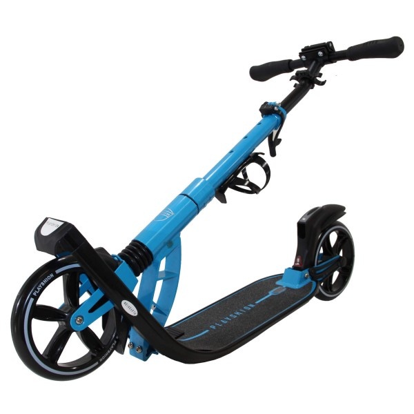 Самокат городской Playshion Moonshine синий - ОписаниеЛегкий комфортный и маневренный самокат Moonshine имеет двойную амортизацию. Оснащен большими колесами из качественного износостойкого полиуретана. На платформу нанесено антискользящее покрытие, благодаря которому ваша нога не соскользнет во время движения. Регулируемый по высоте руль позволяет кататься как детям, так и взрослым! Высота руля настраивается. Качественное торможение обеспечивает мощное и надежное заднее крыло. Дополнительной особенностью модели является флягодержатель. Складной механизм позволит перевозить самокат в общественном транспорте и хранить в квартире.