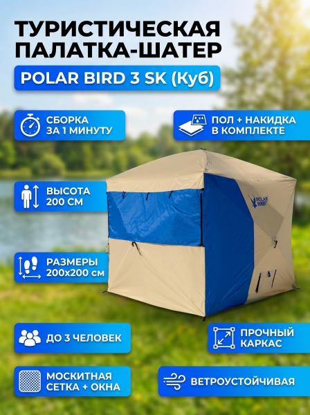 Универсальная палатка-шатер Polar Bird 3SK - ОписаниеЛетняя универсальная палатка-шатер Polar Bird 3 SK для семейного отдыха или хорошей компании в любую погоду. Быстросборная конструкция куб позволяет устанавливать и складывать палатку всего за 1 минуту.