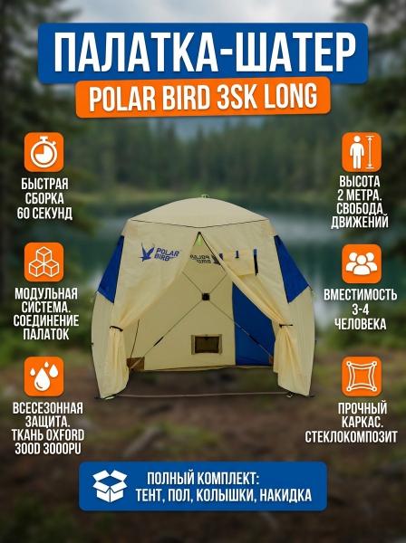 Универсальная палатка-шатер Polar Bird 3SK Long - ОписаниеСомневаетесь? - Посмотрите рейтинг ТОП-10 по категории «Шатры»Обновленная универсальная палатка-шатер Polar Bird 3 SK Long для отдыха летом и зимой. В серии палаток-шатров SK (конструктор), на входе установлена молния, что позволяет создавать различные варианты лагеря, используя дополнительный тент-навес и соединять им между собой палатки. Приобретая палатку Polar Bird, вы получаете большую универсальную палатку-шатер для семейного отдыха или хорошей компании в любую погоду, а быстросборная конструкция куб позволяет устанавливать и складывать палатки всего за 1 минуту.