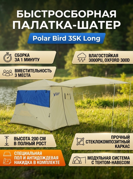 Комплект палатка-шатер летняя Polar Bird 3SK Long + Тент-навес - ОписаниеСомневаетесь? - Посмотрите рейтинг ТОП-10 по категории «Шатры»Комплект палатка-шатер летняя Polar Bird 3SK Long + Тент-навес для кемпинга. Тент-навес предназначен для установки на летнюю универсальную палатку-шатер Polar Bird 3 SK Long. В серии палаток-шатров SK (конструктор), на входе установлена молния, что позволяет создавать различные варианты лагеря, используя дополнительный тент-навес. Тент-навес можно использовать как навес от дождя и солнца, закрытый тамбур для вещей и соединитель со второй палаткой Polar Bird.