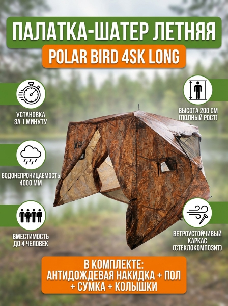 Палатка-шатер летняя Polar Bird 4SK Long (Камуфляж) - ОписаниеОбновленная летняя универсальная палатка-шатер 4SK Long В серии палаток-шатров SK (конструктор), на входе установлена молния, что позволяет создавать различные варианты лагеря, используя дополнительный тент-навес и соединять им между собой палатки.