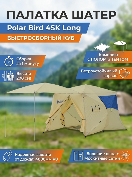 Комплект палатка-шатер Polar Bird 4SK Long + Тент-навес - ОписаниеСомневаетесь? - Посмотрите рейтинг ТОП-10 по категории «Шатры»Комплект палатка-шатер летняя Polar Bird 4SK Long + Тент-навес для кемпинга. Быстросборная конструкция куб позволяет устанавливать и складывать палатку всего за 1 минуту.