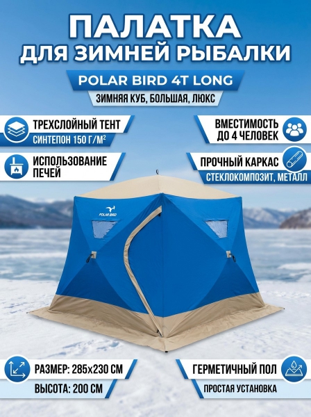 Палатка Polar Bird 4Т long подходит для зимней рыбалки и может выдерживать большие морозы (до -35 градусов). Модель выполнена в форме куба, благодаря чему внутри достаточно много свободного места. Несмотря на то, что она рассчитана на четырех человек, максимально комфортно в ней будет только двоим (с учетом оборудованных спальных мест, хранения личных вещей и установки печки для обогрева).