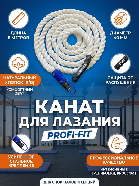 Канат для лазания Profi-Fit 8 м D-40 мм - ОписаниеКанат для лазания 8 м D-40 мм изготовлен из 3-х прядной крученой хлопчатобумажной пряжи. Для подвески каната служит стальная петля с металлическими щеками закрепленная на одном из концов каната, окрашена эмалью. Второй конец каната для лазания оборудован специальным чехлом для того, чтобы предотвратить распушение.