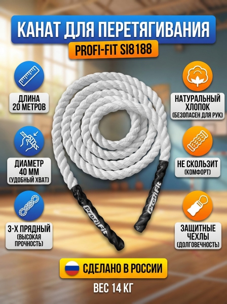 Канат для перетягивания 20 м D-40 мм PROFI-FIT SI8188 - ОписаниеКанат для перетягивания (хб) D40 мм, 20 м. Изготовлен из 3-х прядной крученой хлопчатобумажной пряжи. На концах каната для перетягивания предусмотрены специальные чехлы для того, чтобы предотвратить распушение.