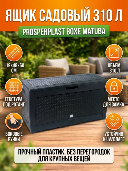 Ящик для хранения Prosperplast Boxe Matuba - ОписаниеЯщик Boxe Matuba используется для хранения садовых принадлежостей, может выполнять декоративные функции. Изделие оснащено прочным корпусом, что увеличивает срок службы. Темный цвет не выгорает на солнце.