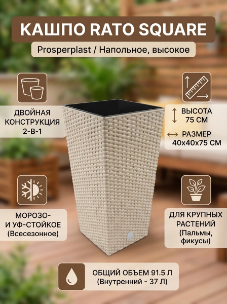 Кашпо для цветов Prosperplast Rato Square - ОписаниеКашпо для цветов Rato Square предназначено для высаживания цветов и растений с развитой корневой системой. Изделие украсит любой современный интерьер. Кашпо состоит из двух предметов - внутренней и декоративной емкостей. Подходит для эксплуатации в квартире и доме, а также за его пределами.