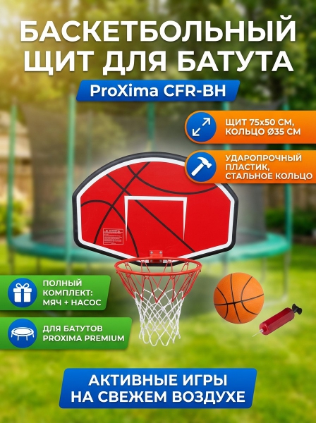Баскетбольный щит с кольцом для батутов Proxima CFR-BH - ДоставкаДоставка по Москве: бесплатно, 1-2 дняДоставка по Санкт-Петербургу: бесплатно, 2-3 дня Доставка по России: стоимость уточняйте у оператора. Баскетбольный щит с кольцом для батутов Proxima CFR-BH - Отзывы0.0