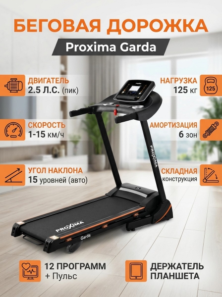 Электрическая беговая дорожка Proxima Garda PROT-514 - ОписаниеСомневаетесь? - Посмотрите рейтинг ТОП-10 по категории «Домашние беговые дорожки»Электрическая беговая дорожка Proxima Garda - надежная и практичная, рекомендована для индивидуального домашнего использования. Дорожка оснащена двигателем Leeson мощностью 1,75 л.с., способным развивать скорость движения полотна от 0,8 до 15 км/ч. Перед установкой в тренажер, мотор прошел специальную процедуру балансировки и тестирования