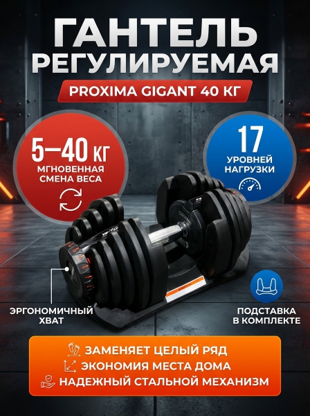 Регулируемая гантель Proxima Gigant 40 кг - ДоставкаДоставка по Москве: бесплатно, 1-2 дняДоставка по Санкт-Петербургу: бесплатно, 2-3 дня Доставка по России: стоимость уточняйте у оператора. Регулируемая гантель Proxima Gigant 40 кг - Отзывы4.9