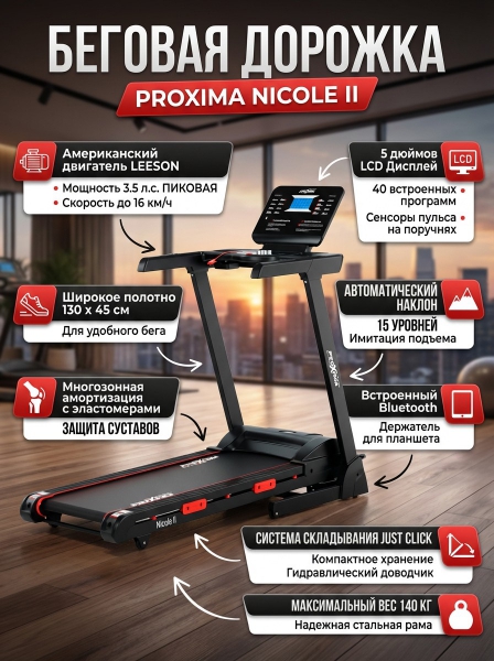 Беговая дорожка электрическая Proxima Nicole ll - ДоставкаДоставка по Москве: бесплатно, 1-2 дняДоставка по Санкт-Петербургу: бесплатно, 2-3 дня Доставка по России: стоимость уточняйте у оператора. Беговая дорожка электрическая Proxima Nicole ll - Отзывы0.0