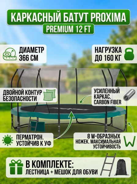 Батут с защитной сеткой и лестницей Proxima Premium 12 FT - ОписаниеБатут Premium 12 FT – универсальное спортивное оборудование для тренировок и веселого времяпровождения. Может использоваться под открытым небом, не боится солнца, дождя, сильного ветра. Рассчитан на многократную сборку/разборку и длительную эксплуатацию. Способен выдержать как детей, так и взрослых.