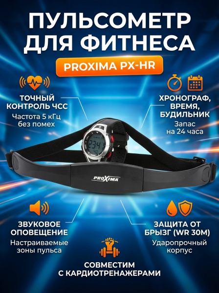 Пульсометр для фитнеса с наручным монитором Proxima PX-HR - ОписаниеПульсометр для фитнеса идеально подойдет не только профессиональным спортсменам и активным любителям фитнеса, но и всем, кому по состоянию здоровья необходимо контролировать сердечный ритм. Также, это идеальный помощник в борьбе с лишними килограммами. Благодаря точности измерения пульса и большому количеству дополнительных опций пульсометр PROXIMA позволит быстро добиться поставленных целей. Комплект состоит из нагрудного ремня с датчиком и монитора, располагаемого на запястье.