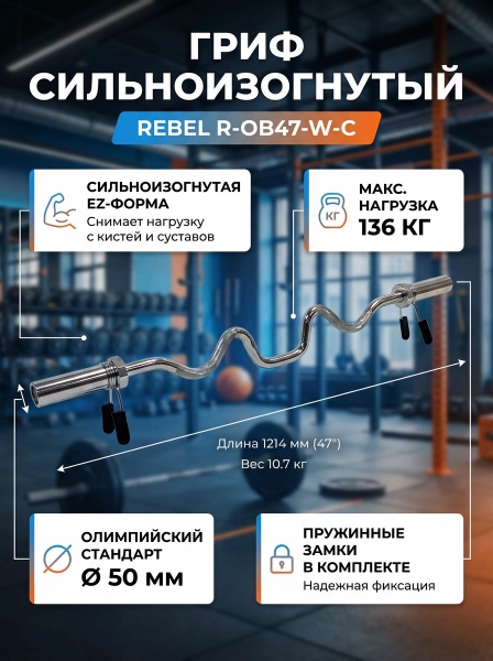 Гриф сильноизогнутый REBEL 47" хром с замками - ОписаниеСомневаетесь? - Посмотрите рейтинг ТОП-10 по категории «Грифы для штанги»Гриф олимпийский сильноизогнутый хромированный 47" REBEL R-OB47-W-C поставляется с пружинными замками FT-OC51-SRR. Вес грифа – 10 кг. Максимальная нагрузка – 136 кг. Длина грифа 1214 мм.