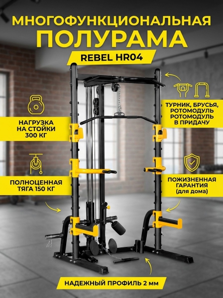 Полурама многофункциональная REBEL HR04 - ОписаниеМногофункциональная полурама REBEL HR04 позволяет осуществлять не только различные тренировки со штангой (жим лежа, приседания), но и работу с грифом с использованием штатного ротомодуля (фиксатора грифа шарнирного). Нагружаемый свободными весами блок позволяет выполнять упражнения – верхняя / гребная тяга. Рукоятки входят в комплект поставки. Также полурама REBEL HR04 имеет встроенный турник и съемные регулируемые по высоте брусья, позволяющие выполнять упражнения на тренировку мышц брюшного пресса. Верхняя балка полурамы REBEL HR04 имеет встроенное кольцо, позволяющее крепить эспандеры или функциональные петли. Для удобства хранения дисков полурама оборудована двумя держателями (олимпийских дисков), одновременно выполняющими функцию стабилизаторов. Для вертикального хранения грифов предусмотрен спаренный стакан, рассчитанный на два грифа.