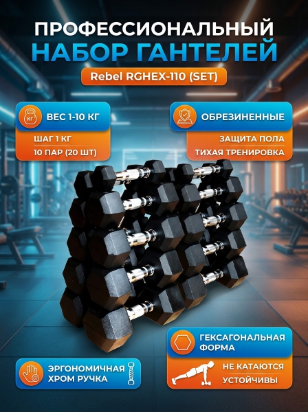 Набор гексагональных гантелей Rebel от 1 до 10 кг (10 пар ) - ОписаниеСомневаетесь? - Посмотрите рейтинг ТОП-10 по категории «Гантели»Набор RGHEX-110 (SET) состоит из 20 гантелей. По две гантели от 1 до 10 кг (шаг 1 кг).