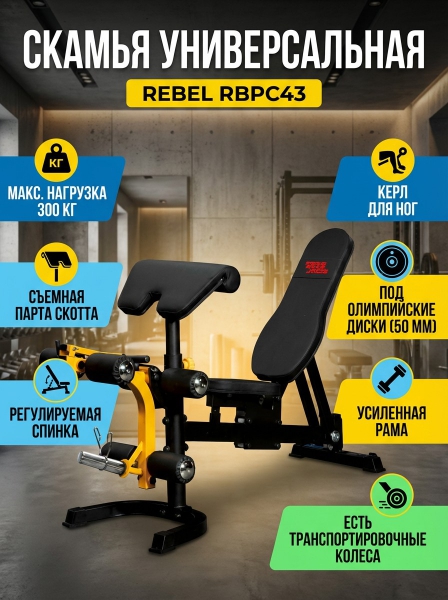 Скамья универсальная REBEL RBPC43 - ОписаниеСомневаетесь? - Посмотрите рейтинг ТОП-10 по категории «Универсальные скамьи»Скамья универсальная с партой Скотта и керлом для ног REBEL RBPC43. Регулируемая по высоте съемная парта Парта Скотта для работы со съемным «грифом», нагружаемым через кёрл для ног. Нагрузочный штырь кёрла рассчитан на использование олимпийских (диаметр 51 мм) дисков.