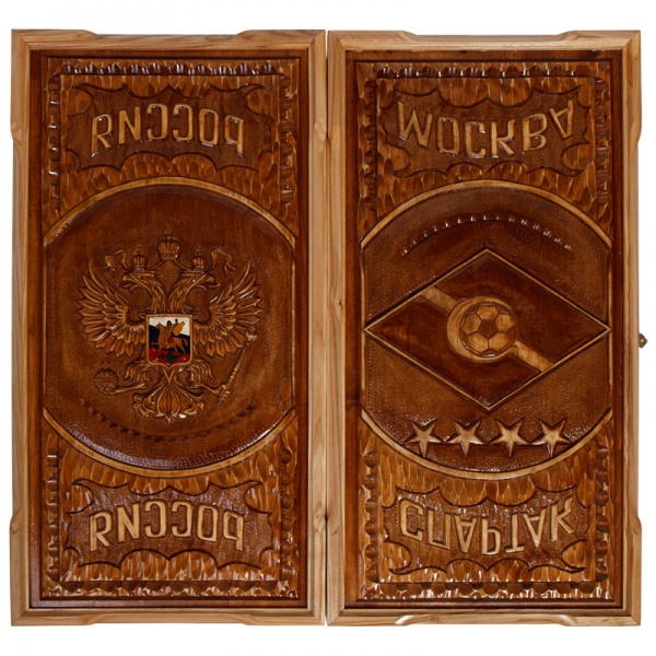Нарды для фанатов футбола РФН slchampion «Спартак» - ОписаниеВысокое качество изготовления нард и используемых материалов. Богатая и красивая резьба 100% ручная работа. На обратной стороне имеется резное поле для шашек, размер клетки - 3 см. При желании можно докупить шахматные фигуры. Деревянные фишки имеют тканевую подклейку. Надёжная и красивая фурнитура. Нарды покрыты качественным консервантом, с его помощью создаётся искусственный эффект состаривания, а так же повышаются защитные свойства дерева. В комплекте входит: чехол, 32 фишки, 2 кубика