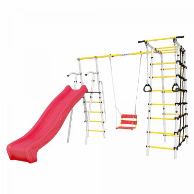 В дачном комплексе предусмотрена удобная и безопасная горка, рядом с которой располагаются качели. Другая часть комплекса состоит из лестницы и турника, а также канатного лаза, сделанного из шнура повышенной прочности. В комплекте также предусмотрены гимнастические кольца. Все навесное оборудование выполнено из атмосферостойких материалов — в летнее время их можно не убирать в дом после занятий. Приключения обещают быть захватывающими!